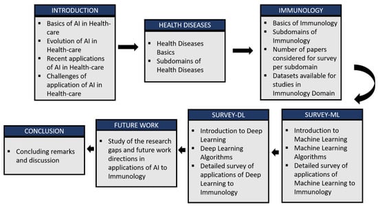 Roadmap of the undertaken study: The roadmap of the proposed review has been represented in Figure 2. In the undertaken study, a systematic literature survey has been conducted focusing on AI in healthcare, applications of machine learning techniques to immunology, and deep learning applications to the different subdomains of immunology. In this review, we have referred to reputed journals and conferences of reputed publishers, such as IEEE, Springer, Elsevier, Willey, and many more. In addition, Scopus and Web of Science search engines are used for reliable results. For searching relevant articles, keywords used are healthcare AI, immunology, deep learning, machine learning, etc. The rest of the paper is organized as follows. Section 4 provides a discussion on what are health diseases and their subcategorizations. Section 5 presents a detailed discussion of immunology as a domain and the different subdomains which come under it, including autoimmune diseases, immunodeficiency diseases, development of vaccines, etc. Section 6 and Section 7 described the detailed review of the state of the arts and most recent applications of machine learning and deep learning, respectively, in immunology. Finally, future directions for research are provided in Section 8 and are followed by the closing remarks in Section 9.