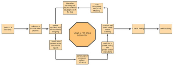 Long gone are the times when the discovery and development of drugs such as vaccines, etc., were considered very long and extremely hazardous processes. With the introduction of machine learning algorithms and AI robots, the process has become much quicker and safer as the machine learning algorithms handle the initial research grunt work, and other heavyweight processes such as identification of predictive biomarkers, target validation, etc., are also easily achieved using different machine learning models [17]. They can also analyze and then predict alternatives to the current paths followed for therapy, especially in multifactorial diseases or even create individual responses to the therapeutic drugs, such as cancer patients [18]. To find the new drugs, you need to, for the most part, forget the rules and look at the clues and patterns that data and previous research provide. Thus, unsupervised learning algorithms are used in this field. One of the novel frameworks for the same is the Seq2seq Fingerprint, a robust model that uses unsupervised learning for drug discovery [25]. Another example of drug discovery using AI is the Project Hanover of Microsoft [26]. It has even helped develop technologies for the treatment and personalizing of drug combinations for acute myeloid leukaemia and certain types of cancers. Figure 6 represents the process flow of drug discovery and manufacturing using AI.