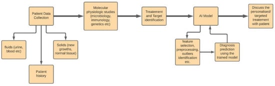 Each patient is unique, and there are many diseases for which the treatments have to be particularly tailored to suit every patient. This can be as simple as suggesting the best multivitamins to a person with low immunity or as serious as the doses and types of drugs needed for acute diseases. Furthermore, with the increasing amount of data available, especially in oncology, Electronic Health Records (EHRs) are now being designed to manage and correlate the different patient profiles by using predictive models such as SVM, ANNs, etc. [27]. The machine learning algorithms can easily sort through and learn from the vast range of treatments available and combine them with the patient’s genetics and medical history to suggest the best possible treatment for them. IBM Watson’s Oncology [28] is an example of patient history being analyzed by machine learning algorithms to generate multiple courses of action. A doctor can then review and select the most suitable one. This makes the entire process quicker and reliable. Figure 7 represents the process flow of applying AI in personalized medicine.