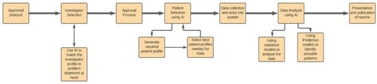 Machine learning can be used to identify and select potential candidates for trials based on predictive technologies. Such methodologies can assist in reporting any adverse events that occur during a clinical trial instead of doing these audits and checks manually. Machine learning can also help in the assimilation and understanding of the results from the clinical trials using clustering or classification algorithms depending upon the needs. Moreover, they can also help in drawing a pool from a wide variety of data points. Machine learning further helps in real-time monitoring of the patient’s data and other statistical tasks like deciding on the sample size, creating well-organized records, etc. Furthermore, it can also help in the accumulation of crowdsourced data. Medtronics and IBM partnered together to perform this very task for the particular case of consolidating diabetes and insulin datasets in real-time. Moreover, Apple’s ResearchKit provides users with access to applications that use machine learning based Facial Recognition to treat diseases like Asperger’s and Parkinson’s. These advancements in data collection will lead to the development of more sophisticated devices and algorithms, which will further improve the applications of AI in healthcare [31]. Figure 8 represents the process flow of AI in clinical trials.