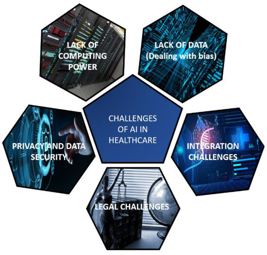 Leveraging patient data to train the AI models to find the patterns between symptoms and other indicators and the possible diseases requires constant interaction with and feedback from the patients themselves. Furthermore, as mentioned above, medical data have many privacy restrictions, and infringement is dealt with differently in areas under different jurisdictions. Thus, there is a chance for the AI development companies to run afoul of these laws, and care needs to be taken to maintain patient confidentiality while obtaining the data they desire [43]. Table 3 lists the key challenges of AI to the healthcare industry.