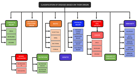 A disease is referred to as any type of illness in either humans or other species. A disease can be acute if the infection is small or chronic if the infection period is comparatively large. Health diseases range widely, not only in humans but in all species present worldwide. They can be divided based on various factors like size, biochemical characteristics, interaction manner, etc. In the undertaken study, we have narrowed them down to a broad domain of diseases and eight major domains: topographic, anatomic, physiological, pathological, etiologic, juristic, epidemiological, and statistical [44]. Figure 10 represents a detailed classification of health diseases.