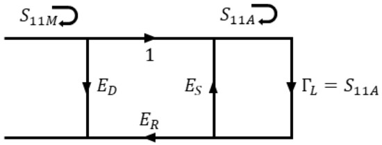 When a measurement of S-parameters representing the transmitted and reflected signals from the device or material under test through a vector network analyzer (VNA) is conducted, various effects in the space where the signal travels from the port of the VNA to the location of the material specimen surface are included. Phase delay and distortion occur as waves propagate through these regions. These effects include the loss of cables and connectors through which signals pass and reflections due to impedance mismatch. In the case of free-space measurement, the characteristics of the of the antenna and the reflections and noises from unwanted experimental circumstances were added. Figure 1 shows the signal flow graph for the measurement environment for the 1-port VNA system [18], and its parameters are expressed as follows.