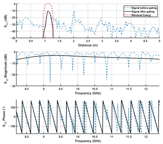 In free-space environments, the multi-reflections from the external environment exist. The time-gating process is conducted to eliminate the multi-reflection components. The process is expressed in Figure 2. First, the target signal in the time domain is selected according to the measurement system. Second, the selected part of the signal is gated with the Tukey window. The gated signal in the frequency domain is much more stable than the non-gated signal.