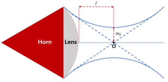 By placing a dielectric (convex) lens behind the horn antenna, the radiated waves can be concentrated, thereby reducing the required distance for the far-field condition and the effect of diffraction at the edge. Depending on the degree of concentration of the electromagnetic wave, a plane wave is emitted, or the wave is focused as a beam. In the former plane wave case, because the far field is formed at a very short distance, it is easy to control the distance between the antenna and the sample. In the focused-beam case, the measurement is carried out by placing the sample around the focal point, assuming that a Gaussian beam is radiated. The focused beam method has some disadvantages. That is, the results become inaccurate as the sample moves away from the focal point and when the thickness of the sample increases. However, the advantage is that the required surface area of the sample is much smaller. The parameters of the lens antenna that need to be considered are the focal length f, which is the minimum distance between the focal point and the lens, and the 3 dB beamwaist , which is the half width at half maximum of the Gaussian beams at the focal point. Figure 3 shows the diagram and parameters of the focused beam lens horn antenna. f and are functions of the frequency because the radiation pattern of the antenna and the refractive index of the lens dielectric vary depending on the frequency. In general, as the frequency increases, the focal length increases, and the beamwaist decreases, as shown in Figure 4 [20].