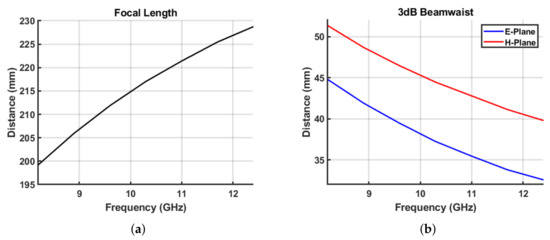 Characteristics of the focused-beam lens horn antenna. (a) Focal Length. (b) 3 dB Beamwaist.