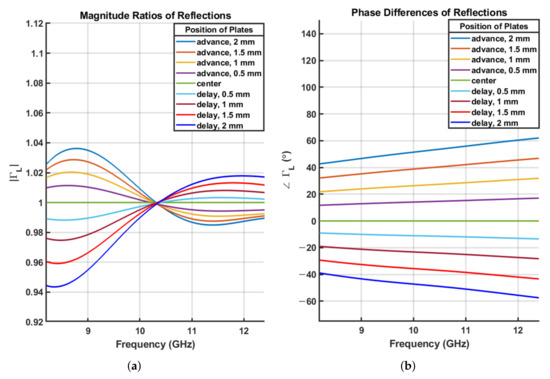 Figure 5 shows the variations in according to the positions of the metal plate in ’Short’ stand measurements. The focal point was fixed at the center of the X-band (10.3 GHz). As the metal plate moved from near (advance) to far (delay), the phase of varied in proportion to the distance. In the lower frequency region, the magnitude of is invariant at the center frequency, but it becomes larger at smaller distances and smaller at longer distances from the focal point. The opposite tendency was observed at higher frequencies. The beam is distorted by focusing or spreading as the frequency changes, and the level of the distortion is increased with the distance of the translation. The distortion of the reflection between advance and delay appears to be anti-symmetrical. Using only one advance or delay in the SSL 1-port calibration cannot remove this distortion; however, if both are used with the same distance, the distortion can be countervailed. This process improves the accuracy by at least 1% of the magnitude of the reflection measurements compared to when only one advance or delay is used.