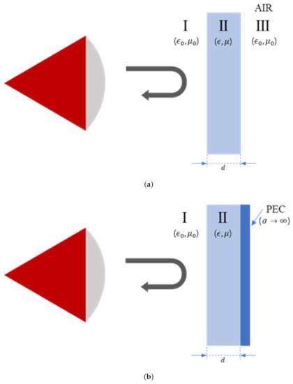 Methods for measuring material properties using reflection properties are reported in [21,22]. In this section, the material property estimation method is presented. The method involves placing two materials with different reflective properties behind the measurement sample and comparing the reflection characteristics of both materials. Two materials, air and a metal plate, were used so that the differences in reflections can be clearly distinguished. The basic concept of this method is similar to the NRW method, in which both the permittivity and permeability are determined from the reflection characteristics. However, as shown in Figure 6, values are measured for two different situations, metal-back and air-back, and the relationship between the transmission/reflection coefficients and with multiple reflections can be derived for these two situations.