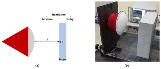 where is the difference between the reflections from the original metal reflector and those from the translated reflector. This method is called the short-short-load (SSL) calibration method and is generally used in mmWave waveguide measurement systems [19]. In general, in the waveguide measurement has the magnitude of not much less than 1 because of the low conductor loss. However, the magnitude of in free-space measurements varies significantly according to the radiation characteristics of the antenna. The distances of translation and the magnitudes of need to be determined, as explained in the next Section 2.2, considering the characteristics of the focused beam lens horn antenna.