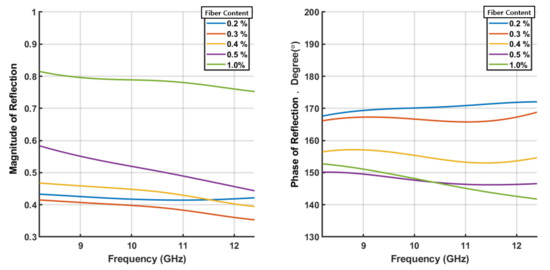 Concrete with sufficient curing and drying is considered to require a mixture of various types of dielectric materials. The equivalent relative permittivity of typical concrete varies depending on the composition of the mixture such as cement and aggregate and is known to have a value of approximately 5–10 in microwave frequencies. Meanwhile, the imaginary part of the relative permittivity, which determines the attenuation of the electromagnetic wave propagating inside the concrete, has a value of 1 or less [9]. When a conductive material is added in the dielectric, the effect of the electrical conductivity of these conductive inclusions appears as an imaginary part of the effective permittivity of the mixture [10]. Reinforced concrete with rebar exhibits an electromagnetic shielding effect at low frequencies and has a large-scale wire-mesh structure [11]. In the case of the SFRC, the electromagnetic properties are changed by the electrically small steel fiber. As the content of the steel fiber increases, the properties of the entire mixed concrete become more likely to be conductive; as a result, the reflection increases and the transmission decreases [12].