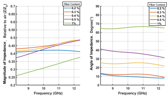 The magnitude and phase of the reflection characteristics for the specimens are shown in Figure 8. The magnitude and angle of the impedance for the SFRC samples are calculated as shown in Figure 9. The magnitude of the impedance is expressed as a relative value with respect to the impedance of the free space, . The relative complex permittivity () calculated from the impedance, assuming that the relative permeability () of the specimens is unity, is shown in Figure 10 for five different steel fiber concentrations.