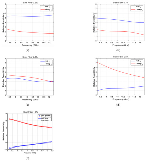 Complex permittivity of each fiber concentration. (a) SFRC 0.2%. (b) SFRC 0.3%. (c) SFRC 0.4%. (d) SFRC 0.5%. (e) SFRC 1.0%.