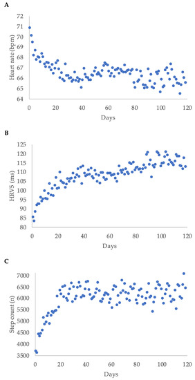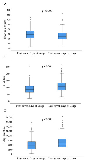Between the first and last seven days of usage, median heart rate significantly decreased (p < 0.001), while median step count per day (p < 0.001) and HRV5 significantly increased (p < 0.001) (Table 2, Figure 4).