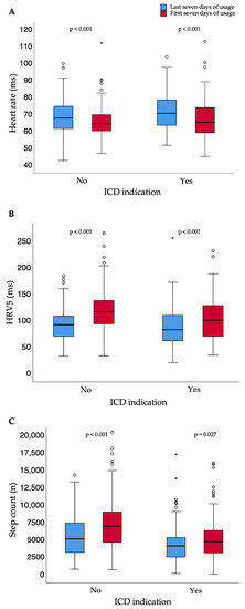Heart rate (A), heart rate variability approximate (B), and step count (C) for the first and last seven days of usage for patients with and without ICD indication after the end of WCD prescription time; small circles represent outliers (data points outside the range of 3rd quartile + 1.5* interquartile range or 1st quartile − 1.5* interquartile range); asterisk represent extreme outliers (data points outside the range of 3rd quartile + 3* interquartile range or 1st quartile − 3* interquartile range); bpm = beats per minute; ICD = implantable cardioverter–defibrillator; HRV5 = heart rate variability approximate.