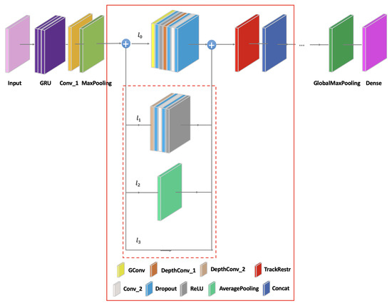 The input layer is fed by the original signal data. The gate recurrent unit (GRU), two-dimensional convolution (Conv_1), and MaxPooling pre-process the signal data. There are 512 cells in GRU, and the convolution kernels are in other two pre-processing layers. The overall network structure is constructed by superimposing the multi-routing units (red solid wireframe). At the beginning of each unit, the network input is divided into different branches. The main branch consists of seven basic layers, including group convolution (GConv) with the convolution kernel of , three dropouts, ReLU activation function (ReLU), depthwise convolution (DepthConv_1) with the convolution kernel of , two-dimensional convolution (Conv_2) with the convolution kernel of . The three branches that can be selected on the auxiliary path correspond to ,,, respectively (red dotted wire frame). The auxiliary branch consists of five basic layers, including DepthConv_2 that has the convolution kernel, two dropouts, Conv_2, and ReLU. The auxiliary branch includes the average pooling (AveragePooling), and the auxiliary branch is a directly connecting link. The track restructure (TrackRestr) is the feature exchange operation between the different branches, and the concatenate layer (Concat) splices the extracting data from the different branches for continuing to learn in the next network unit. The structure is realized through the superposition of the multi-routing units. The corresponding formula is as follows: