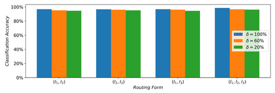 Figure 7 shows the classification performance with different routing forms. There are the superposition of three units in the network structure. represents the method of the auxiliary selection corresponding to the intermediate overlay units. Other forms of have similar meanings, and X is the different choice of , , or . is the percentage of the selected packet range as a track for the exchange between auxiliary branches. In the 12 different hybrid routing forms, 12 ship types can be effectively identified. When is , there are similar classification results in the different routing forms. With the increase in , the classification ability differs from the the selection mode of auxiliary branches. The form of increases by approximately , , and compared to the three forms of , , and at , which has a distinct advantage over other routing forms. The presence of different routing forms turns out to be the sheep herd performance. slightly improves , , and than the other three routing forms of , , and at . is better around , than compared to , , which performed better at , of the other three routing forms on average. When the sufficient exchange of the signal data are provided to the used network, more high dimensional signal features are extracted, which helps to identify ship types. The further addition of routing branches did not improve classification accuracy due to the fact that the hybrid routing network can more effectively extract the signal features by the full exchange of tracks, and the advantageous classification effect can be achieved under the form; this explains the fact that the hybrid routing network is an efficient method for ship-type classification.