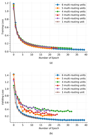 Figure 8 shows the convergence performance for the used network during the training and validating process, which involves different multi-routing units. In Figure 8a, the training signal dataset send data across the used network to obtain the training losses by the categorical cross-entropy. In Figure 8b, the validating signal dataset verify the trained network to obtain the validating losses, and the validating results are obtained by the same loss function, such as the training losses. In horizontal axis, the number of epoch is the learning number of the training process, which represents a whole training or validating dataset that moves through the network and returns once. At the beginning, the six kinds of the used network structures show a rapid convergence in the iterative procedure of the top five. When the multi-routing unit is six, the training loss obtains the best results, which has a longer epoch number. There is a similar convergence performance for the other five, which is higher than the multi-routing unit of six by an average of more than 0.004. As the multi-routing unit number increases, the epoch number displays a declining trend.