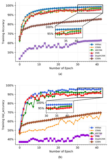 Classification results between different networks. (a) Training accuracy. (b) Validating accuracy.