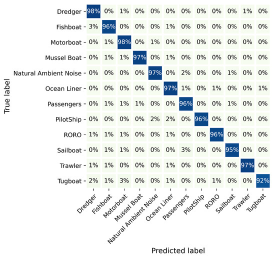 In Figure 9, the used network is compared with DNN [13], ADCNN [15], DepthCNN [16], CDBN [17], and CRNN [18]. HRNet is the hybrid routing network method. In Figure 9a, HRNet has the better classification result than other networks in the epoch range of 0 and 6, and the recognition performance of CRNN is close to the used network, which significantly outperforms DepthCNN and CDBN. ADCNN and DNN have almost the same classification result when compared to HRNet, and the former are 4.96% than the latter. From the sixth epoch to the thirty-second epoch, the results generated by CRNN, ADCNN, and DNN share a great deal of similarity, which are 3.18% smaller than HRNet on average. At the scope from 33 to 43, HRNet is substantially higher than other networks in the classification rate, which is around 0.98%, 2.43%, and 3.17% than CRNN, ADCNN, and DNN on average, respectively. This shows that HRNet is structurally superior and obtained a more advanced classification of signals. In the validating accuracy process, there is an impressive melioration in the classification effect of all networks in Figure 9b. The reason for vibration is that the training dataset is not completely corresponding to the validating dataset. HRNet shows impressive performance compared to the five other networks. ADCNN and DNN show an approximate tendency toward the classification effect; they are less effective than HRNet, which is 4.46% and 3.67% better than ADCNN and DNN, respectively—this is due to the fact that the hybrid routing network structure enriches the feature extraction of signals, which gain a better performance than CRNN, ADCNN, DNN, DepthCNN, and CDBN. In the classification of 11 ship types, HRNet recognizes more than 95% in Figure 10, and the accuracy of the Tugboat can also achieve 92%, which proves the target recognition ability of HRNet.