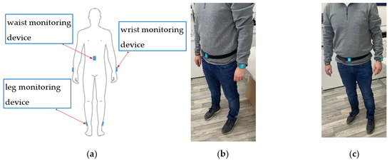 (c–e) PDMonitor® accessories: used to attach the MDs to the patient’s waist on the shanks, wrists and waist (ClipFrame, Wristband and StrapFrame). The actual device placement is presented in Figure 2.