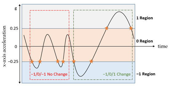 Taking under consideration that for human arms the degrees of freedom of motion are generally higher compared to all other body parts, considerably more inertial sensor orientation changes are expected. These orientation changes are most clearly evident in the accelerometer signal, and in particular in the x-axis, which according to the global frame (Figure 3) is aligned parallel to the forearm. Initially, the signal is low-pass filtered at 0.5 Hz to isolate the gravity component. Then, the values of the filtered accelerometer signal are split in three distinct areas, with region 0 containing values (−0.25, 0.25), region 1 with values (0.25, ∞) and region −1 with values (−∞, −0.25) (Figure 4). Each time the value of the accelerometer changes regions, the pattern of the last three regions, which the signal has traversed is compared to the patterns [−1, 0, 1] and [1, 0, −1], which are defined as zero-crossings, implying that the accelerometer has gone from looking downwards to looking upwards or vice versa. The zero-crossings identified are defined as the orientation changes.