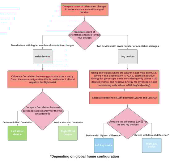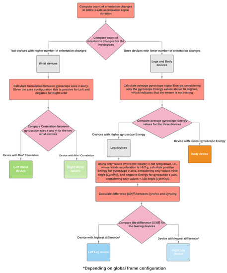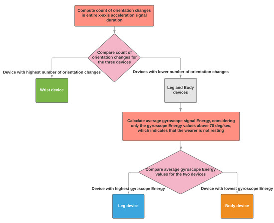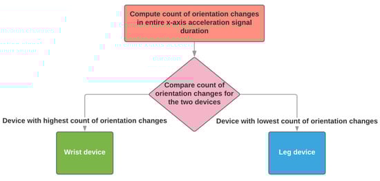 When two sensing devices are used, the algorithm supports the configuration of using one on a wrist and one on a shank. The identification of the wrist and shank sensing devices depends on the number of orientation changes (see Section 2.2.1).