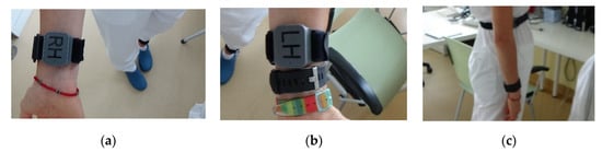 PDMonitor® wrist-worn sensors attached against instructions, facing towards the torso when standing with hands down (ventral side): (a) Right Hand (wrist); (b) Left Hand (wrist); (c) side view.