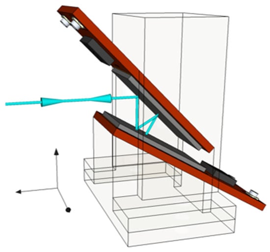 In order to minimize reflection losses, the PQED assembly consists of two photodiodes mounted in light-trap configuration with an angle of 15° between the diodes, as depicted in Figure 2. In this configuration, the light beam undergoes 7 reflections (one at 0° degree and 2 at 15°, 30°, 45°) following the same incoming and outgoing paths [,,]. Using the results of the ellipsometry measurements performed on passivated test wafers, the reflectance for this PQED configuration was simulated as a function of wavelength for different dielectric thicknesses to determine the optimal thickness for minimum reflectance.
