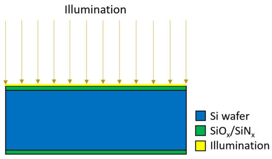 In order to predict the internal quantum deficiency of photodiode, two-step simulation was performed using the Genius Device Simulator from Cogenda []. The first step is to determine bulk lifetime and surface recombination velocity (SRV) by using 2D simulation structure and the QSSPC lifetime measurement. This method has previously been presented by Stokkan et al. []. The 2D lifetime simulation structure is shown in Figure 3. The structure consists of a 500 µm thick, high resistivity silicon substrate passivated identically on both sides by SiO2 and/or SiNx with thickness of two mesh elements. The width of the simulated structure is 7 mm. Excitation light with a wavelength of 808 nm is used for charge carrier generation in the simulation, which is the same wavelength as used in lifetime measurements.