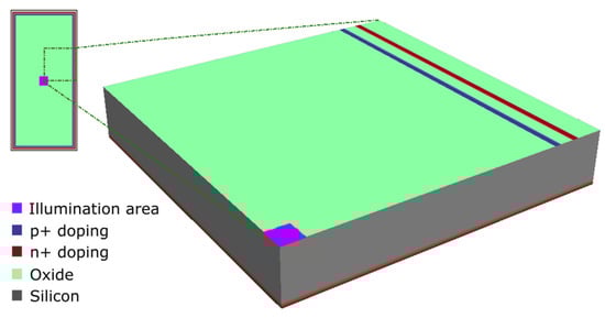 The second step is predicting the IQD of a photodiode, if manufactured by the given passivation recipe, by using a 3D simulation structure as shown in Figure 4 []. The structure consists of a doped silicon substrate, which is covered by a dielectric layer on the top and a doped layer on the bottom. Electrodes for electrical contacts are represented by n+ doping and p+ doping on top of the silicon substrate. Only 1/8 of the real device is used in the simulation due to computational limiting reasons, and the symmetric boundary conditions are applied to obtain the response of the whole photodiode. Besides the fabrication parameters which include fixed charge, doping concentration, etc., the fitted values , , and from the 2D simulation are used as input parameters in the 3D simulation model.