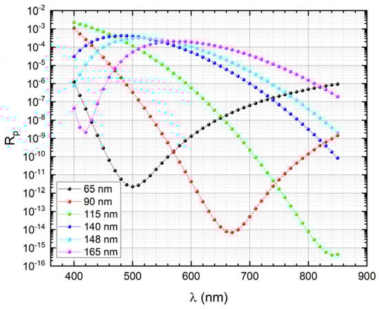 Simulated p—polarization reflectance as a function of wavelength for PQEDs mounted in trap configuration with an angle of 15° between the diodes. In this configuration the light beam undergoes 7 reflections: one at 0° degree and two reflections at 15°, 30°, and 45°. The reflectance is reported for six different thicknesses of the SiNx.
