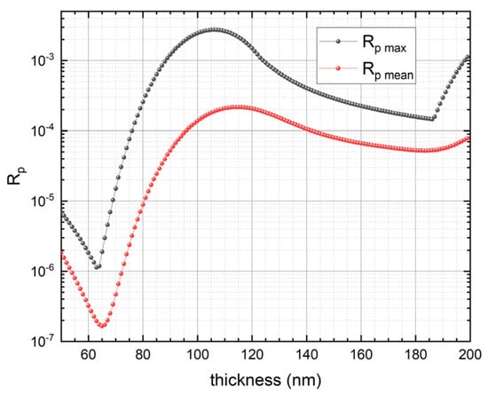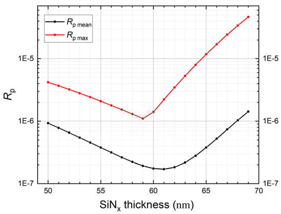 Maximum and mean values evaluated in the wavelength interval 400—850 nm of the p-polarization reflectance as a function of SiNx thickness for PQEDs mounted in trap configuration with an angle of 15° between the diodes.