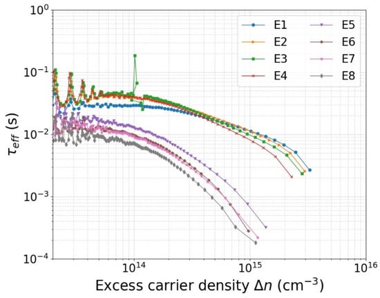The QSSPC measurement results of all eight test samples that have gone through the processes described in Table 1 are shown in Figure 8. The wafers with a buffer layer of 6 nm thermally grown SiO2 underneath SiNx clearly have a longer minority carrier lifetime, particularly at higher injection levels. The samples without SiO2 (E5, E6, E7, and E8) show a similar trend among each other. The samples that have thicker SiNx and have gone through annealing in forming gas exhibit somewhat higher lifetime values over the entire range of injection density. This is in line with expectation, but the difference is quite small. The samples with a SiO2 layer (E1, E2, E3, and E4) also exhibit similar lifetime values among each other, but the trend as a function of injection level is slightly different at very low and very high injection levels.