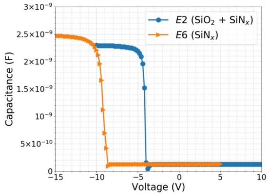 Capacitance—voltage (C—V) measurement results of MIS capacitors prepared with the passivation processes E2 (6 nm SiO2 + 65 nm SiNx) and E6 (65 nm SiNx) as described in Table 1, at a frequency of 1 kHz.