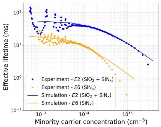 Figure 11 shows the fit of the 2D simulation with the measured injection-dependent effective lifetime for passivation processes E2 and E6. The simulated lifetime curves are obtained using the following fabrication and test parameters as inputs: substrate doping type (p-type), substrate doping concentration (2 × 1012 cm−3), substrate thickness (500 µm), and measured fixed charges (1.3 × 1012 cm−2 for E2 and 4.0 × 1012 cm−2 for E6). The simulated lifetime is in an excellent agreement with the measured one up to an injection level of 2 × 1015 cm−3 for E2. For E6, on the other hand, the simulated lifetime fits the measured lifetime well only at lower injection levels and diverges from the measured one at injection levels above 2 × 1014 cm−3. The bulk lifetime and surface recombination velocities obtained from these fits are reported in Table 3.