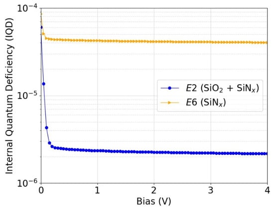 Simulated IQD as a function of reverse bias voltage for p-type inversion-layer photodiode that would be fabricated with passivation E2 (6 nm SiO2 + 65 nm SiNx) and E6 (65 nm SiNx) as described in Table 1. The simulations were performed at a wavelength of 488 nm.