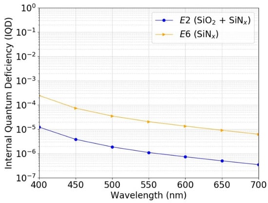 Simulated IQD as a function of wavelength for p-type inversion-layer photodiode that would be fabricated with passivation E2 (6 nm SiO2 + 65 nm SiNx) and E6 (65 nm SiNx) as described in Table 1. The simulations were performed at a reverse bias voltage of 5 V.