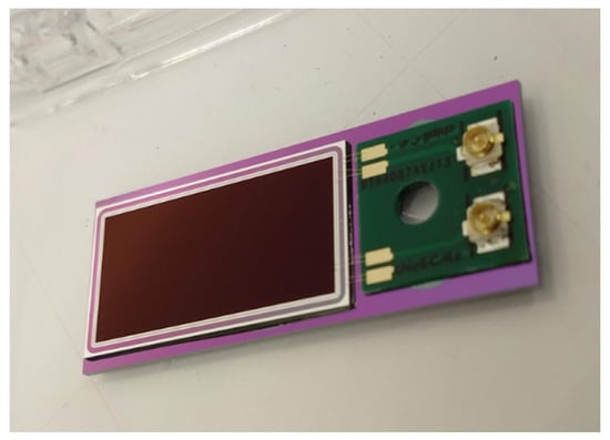 The photodiodes with physical dimensions of 13 mm × 24 mm (active area dimensions of 11 mm × 22 mm) were adhesively bonded to silicon carriers having dimensions of 15 mm × 38 mm (Figure 15). On the remaining space on each carrier, a 12 mm × 12 mm printed circuit board (PCB) was glued. The PCB and chip carrier have 3 mm diameter holes for screw assembly into PQED mechanics. Wire bonds were made between the photodiode and the PCB using an Au ball-wedge bonder with 17.5 µm wire diameter. U.FL connectors soldered to PCB enables electrical connections to external instruments.