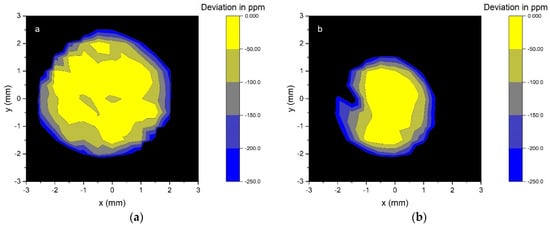 The PQED with purely SiNx passivation layer had 9 ppm higher responsivity than the reference PQED, while the PQEDs made of SiO2/SiNx stack photodiodes P18-55-45 and P18-54-44 had 36 ppm and 16 ppm higher responsivity than the reference PQED, respectively. The standard uncertainty of 30 ppm of the above results is determined by the photocurrent ratio measurement and spatial uniformity of the detectors (Figure 16). After taking into account the negligible reflectance loss of SiNx and SiO2/SiNx stack PQEDs, these results translate into measured IQD values of 28 ppm (SiNx), 1 ppm (P18-55-45), and 21 ppm (P18-54-44). This confirms that the manufactured photodiodes with the SiO2/SiNx stack have a very low IQD.