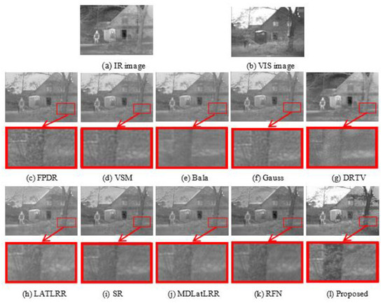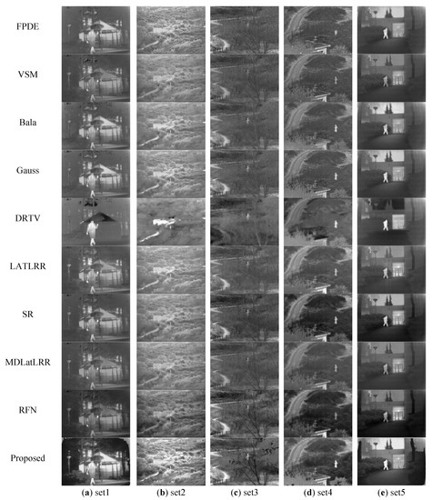 | Images | FPDE | VSM | Bala | Gauss | DRTV | LATLRR | SR | MDLatLRR | RFN | Proposed |