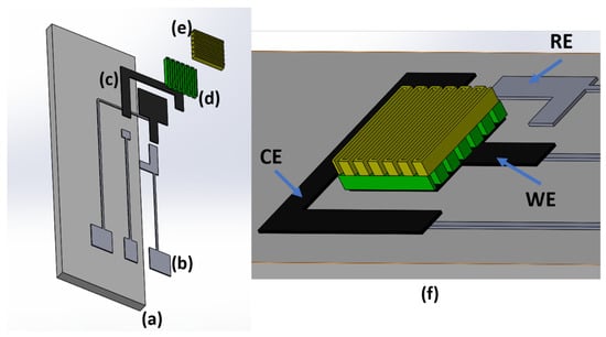 Considering this evidence from the literature, the proposed 3D electrodes were designed to provide a 15 mm2 WE base area and to fit in a 10 × 30 mm alumina substrate, compatible with a commercial connector for screen-printed electrodes. A two-material architecture was selected to provide good electrode conductibility, stable RE and inert CE and WE. According to those choices, silver chloride (AgCl ink, XA-3773, Fujikura Kasei Co. Ltd., Shibakouen Minato-ku, Tokyo, Japan) was employed for conductive tracks, pads, and RE, and carbon (C ink, EXP 2652-28, Creative Materials Inc., Ayer, MA, USA) ink for WE and CE coating and further microstructuration. A 3D rendering of the electrode structure is provided in Figure 1.