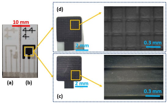 Step by step produced electrodes. (a) Silver Chloride conductive tracks and RE, (b) WE and CE carbon coating, (c) line microstructuration, (d) grid microstructuration.