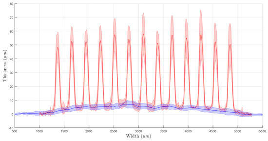 Average profiles of the WE of the produced electrodes. In blue, the bare WE are presented, while the microstructures are represented in red. As before, solid lines represent the average thickness, and shaded areas represent the standard deviation.
