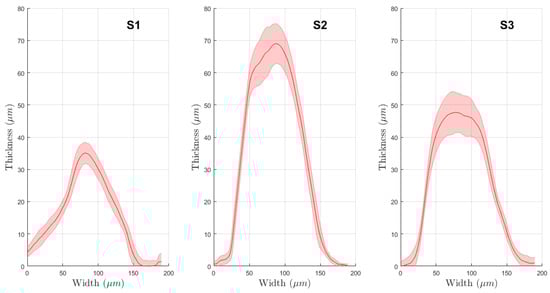 Microstructuration profile obtained for test microstructuration on bare alumina. The solid line depicts the average thickness of the peak while the shaded area represents the standard deviation. That statistical information was obtained from 60 sample peaks.