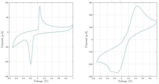 Voltammograms obtained after two experiments performed in pure PBS (left) and in 8 mM ferro/ferricyanide solution (right) with a scan rate of 200 mV s−1.