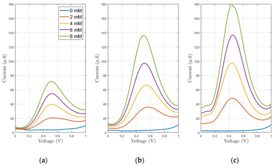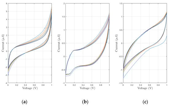 Preliminary experiments were performed to evaluate the feasibility of our approach and to determine important electrode’s characteristics. At first, different cyclic voltammetry (CV) experiments were performed both in pure PBS as blank solution and in ferro/ferricyanide solution. As reported in Figure 7, CV produced by the ferro/ferricyanide solution present two well-distinct peaks at 0.45V and −0.1 V. As regards the CV produced by the blank solution, they present two spurious peaks at around 0.1 V and −0.2 V. Different potential windows were tested to minimize the impact of the undesired peaks. In the end, a [0; 1] V potential window was chosen because it suppresses all the unwanted peaks and allows identifying the oxidative peak of the analyte of interest. In Figure 8, eight CVs obtained in blank solution for each sensor’s microstructuration are reported. CVs present similar peak currents and shapes. Moreover, a quick stabilization after only few cycles can be appreciated.