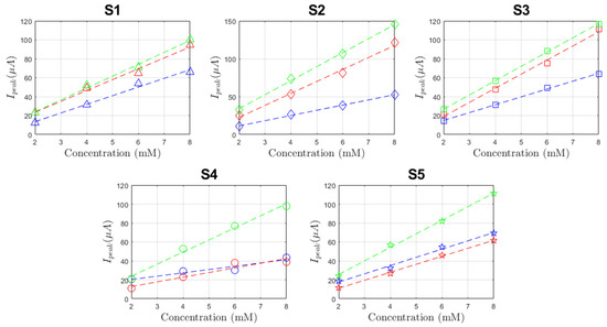 In Figure 9, the data collected from DPV performed on each configuration (bare, lines and grid microstructuration) on a single sensor are reported. There, it is possible to observe an overall improvement of the peak current for each concentration. This implies ease of detection of the analyte using microstructured devices rather than through non-microstructured ones. To further inquire about the sensitivity of our devices, the peak width was extracted through the PSTrace 5.8 software that provides both the peak current and position. The latter, expressed as peak voltage, is stable for all three configurations, resulting as slightly higher on average for plane electrodes at (504.65 ± 16.75) mV, rather than on line-microstructured (479.75 ± 37.94) mV and grid-microstructured (468.94 ± 22.92) mV electrodes. As regards the peak currents, each sensor was compared separately. In Figure 10, the peak currents are related to the analyte concentration to obtain three calibration curves for each sensor. Those curves resulted as linear as expected from the theoretical background [24,25]. Considering the sensitivity as the slope of the fitting line, it was shown that grid microstructures deposition improved the sensitivity with respect to the bare devices on average of 2.3 times, while the line microstructures produced an improvement of 1.5 on average. It was also shown that those microstructurations do not interfere with the linearity of the device (the linear fit produced an R2 > 0.98). The variability among the different sensors is due to the multiple variables that influence the electrochemical process. For example, the differences of the obtained microstructured profiles play a major role in defining the different changes in the sensitivity of the sensors. In detail, it resulted that the line microstructuration for sensor S1 produced a 25% improvement of the sensitivity with an average peak thickness around 35 µm and an estimated added area of 8%, while sensor S2 experienced a 130% variation due to peaks up to 70 µm that produced an estimated added area of 33%. These data present (Figure 11) a linear dependence between the percentual increase of the slope and the one of area, as already foreseen by Equations (1) and (2).