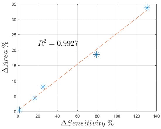The obtained relationship between the microstructuration-added electrode area and the increase in sensitivity. The blue asterisks represent the data points, and the dashed red line is the best fit line that presents R2 = 0.9927. The data for the added area were extracted from the profiles presented in Figure 6.