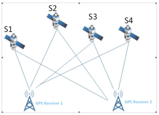 The positioning accuracy in GPS single-point positioning is affected by factors such as clock errors, signal propagation errors, and satellite-orbit errors. Although some of the system errors can be reduced by model correction, the corrected residual errors are still not negligible. Therefore, GPS relative positioning, also called GPS differential positioning, has been developed to effectively minimize these errors. Similarly, GPS relative positioning is also divided into static relative positioning and dynamic relative positioning. The basic schematic diagram is shown in Figure 3.