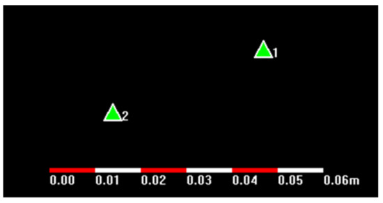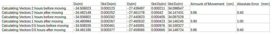 The test method was as follows: first, the same period was observed using two devices, A and B, before moving. In addition, the relative baseline vector was then obtained between the two points after the baseline solution. After that, the device was fixed, device B was moved, and the baseline vector of the two points after moving was obtained with the same method. Finally, using the fixed device, A, as the starting point, the displacement distance between the two vectors was calculated to measure the amount of equipment movement. As the movement amount of device B was known in advance through measurement, the absolute measurement error of the movement amount of the GPS could be obtained by comparing the data calculated by the device with known data. The data processing was performed using CGO software and broadcast ephemeris. The data processing took two hours, one hour, or half an hour. The actual movement amount was 5.8 cm, and the test result is shown in Figure 8.